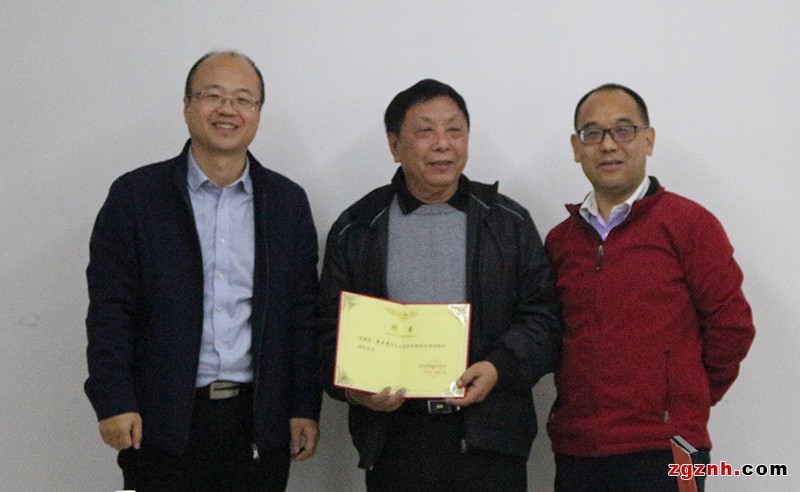 為麥慶發(fā)先生頒發(fā)顧問證書(左--曹廣忠 中--麥慶發(fā) 右--石錫銘)