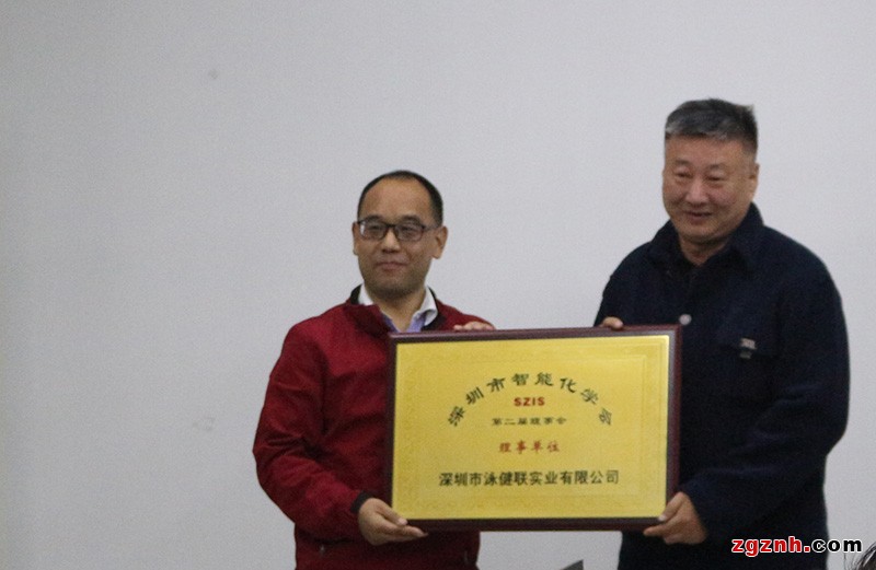 為深圳市泳健聯(lián)實(shí)業(yè)有限公司頒發(fā)理事單位牌匾(左--石錫銘 右--梅建彬)