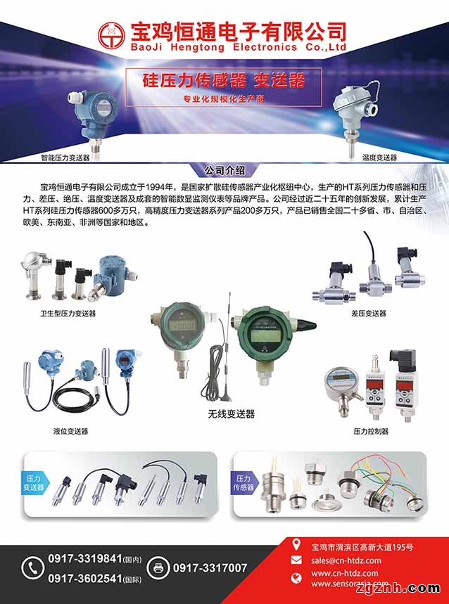 寶雞恒通電子有限公司成立于1994年,主要研發(fā)生產(chǎn)銷售HT系列擴(kuò)散硅壓力傳感器,差壓傳感器以及汽車專用傳感器和空壓機(jī)專用傳感器等;各類壓力、差壓、絕壓、液位、溫度變送器及成套的智能數(shù)顯監(jiān)測(cè)儀表等產(chǎn)品??蛻舯椴己娇蘸教臁⑹突?、水利水文、電力、煤炭冶金、液壓機(jī)械、城市供水、供氣、供熱等行業(yè)。