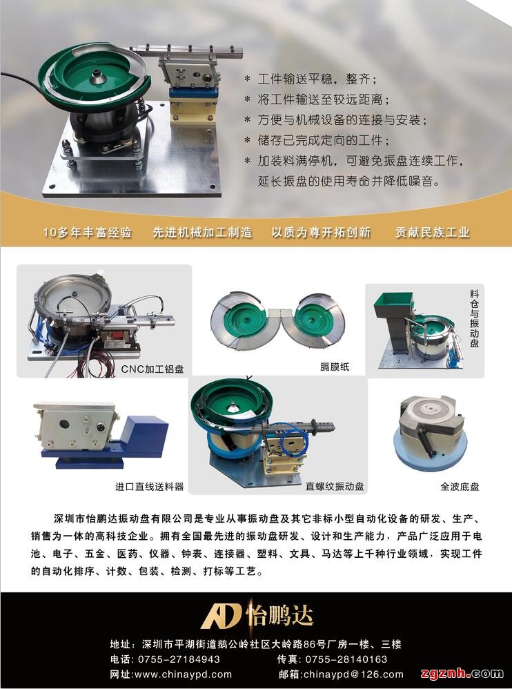 深圳市怡鵬達(dá)自動化設(shè)備有限公司是一家專業(yè)從事振動盤生產(chǎn),銷售,服務(wù)為一體的高新技術(shù)企業(yè)。公司占有地面積 2000 平方米,位于經(jīng)濟(jì)特區(qū)深圳,員工30 余人。公司設(shè)備齊全,環(huán)境優(yōu)雅,技術(shù)實(shí)力雄厚。