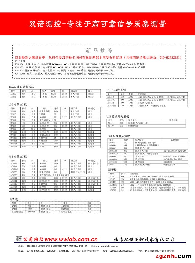 北京雙諾測控技術(shù)有限公司(wwlab)是一家專門從事數(shù)據(jù)采集、工控板卡及模塊產(chǎn)品研發(fā)與生產(chǎn)的專業(yè)技術(shù)公司。產(chǎn)品系列目前包括:PC總線、USB、端子與調(diào)理模塊、嵌入系統(tǒng)應(yīng)用模塊等系列,能夠基本滿足各種行業(yè)用戶的需求。并在醫(yī)療、電力、軍事、通訊等相關(guān)工業(yè)領(lǐng)域中建立了廣泛的合作關(guān)系。