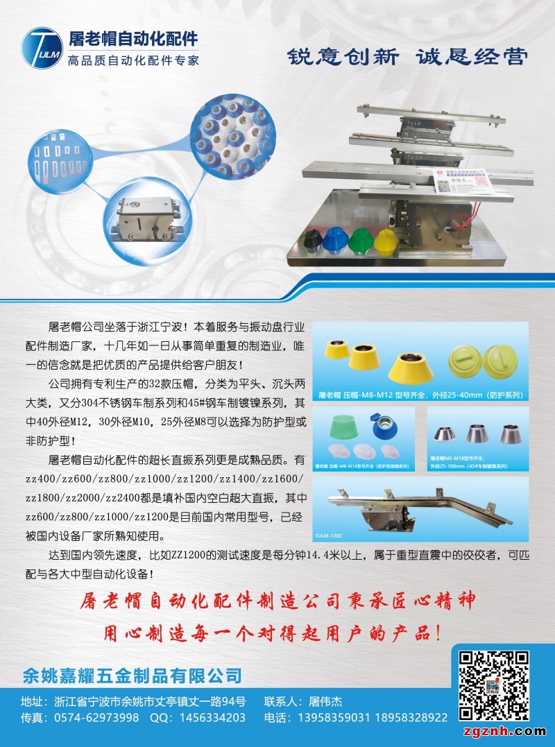 屠老帽公司坐落于浙江寧波!本著服務(wù)與振動(dòng)盤行業(yè)配件制造廠家,十幾年如一日從事簡(jiǎn)單重復(fù)的制造業(yè),唯一的信念就是把優(yōu)質(zhì)的產(chǎn)品提供給客戶朋友!