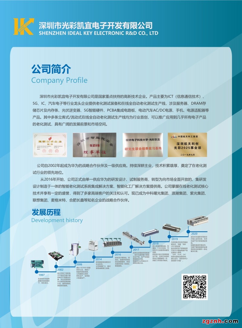 深圳市光彩凱宜電子開(kāi)發(fā)有限公司是國(guó)家級(jí)高新技術(shù)企業(yè)。產(chǎn)品主要為ICT(信息通信技術(shù))、5G、IC、汽車(chē)電子等行業(yè)龍頭企業(yè)提供老化測(cè)試裝備和在線全自動(dòng)老化測(cè)試生產(chǎn)線,已涉及服務(wù)器、DRAM存儲(chǔ)芯片及內(nèi)存條、光伏逆變器、5G智能硬件、PCBA集成電路板、電動(dòng)汽車(chē)AC/DC電源,手機(jī),電源適配器等產(chǎn)品。其中多條立庫(kù)式/流動(dòng)式在線全自動(dòng)老化測(cè)試生產(chǎn)線均為行業(yè)首創(chuàng),可以推廣應(yīng)用到幾乎所有電子產(chǎn)品的老化測(cè)試,具有廣闊的發(fā)展前景和市場(chǎng)空間。