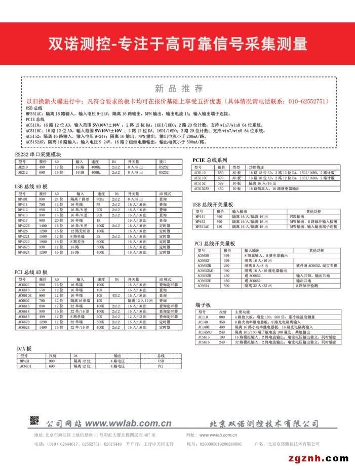 北京雙諾測控技術(shù)有限公司(wwlab)是一家專門從事數(shù)據(jù)采集、工控板卡及模塊產(chǎn)品研發(fā)與生產(chǎn)的專業(yè)技術(shù)公司。產(chǎn)品系列目前包括:PC總線、USB、端子與調(diào)理模塊、嵌入系統(tǒng)應(yīng)用模塊等系列,能夠基本滿足各種行業(yè)用戶的需求。并在醫(yī)療、電力、軍事、通訊等相關(guān)工業(yè)領(lǐng)域中建立了廣泛的合作關(guān)系。