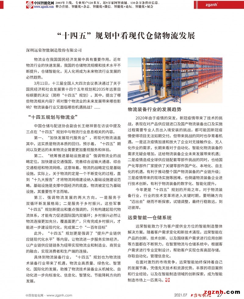 27 “十四五”規(guī)劃中看現(xiàn)代倉儲物流發(fā)展 /深圳遠(yuǎn)榮智能制造股份有限公司