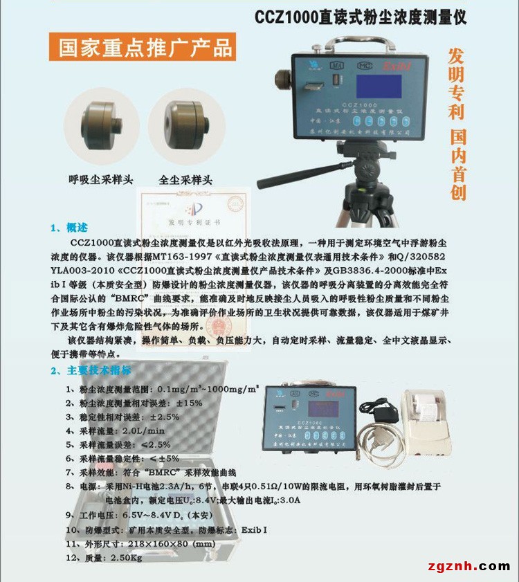 CCZ1000直讀式粉塵濃度測(cè)量?jī)x(以下簡(jiǎn)稱測(cè)量?jī)x)是以紅外光吸收法原理,一種用于測(cè)定環(huán)境空氣中浮游粉塵濃度的儀器。該儀器根據(jù)MT163—1997《直讀式粉塵濃度測(cè)量?jī)x表通用技術(shù)條件》和Q/320582YLA003《CCZ1000直讀式粉塵濃度測(cè)量?jī)x》技術(shù)條件及GB3836.4─2000標(biāo)準(zhǔn)中ExibI等級(jí)(本質(zhì)安全型)防爆設(shè)計(jì)粉塵濃度測(cè)量?jī)x器,該儀器的呼吸分離裝置的分離效能完全符合國(guó)際公認(rèn)的“BMRC”曲線要求,能準(zhǔn)確及時(shí)地反映接塵人員吸入的呼吸性粉塵質(zhì)量和不同粉塵作業(yè)場(chǎng)所中粉塵的污染狀況,為準(zhǔn)確評(píng)價(jià)作業(yè)場(chǎng)所的衛(wèi)生狀況提供可靠數(shù)據(jù),該儀器適用于煤礦井下及其它含有爆炸危險(xiǎn)性氣體的作業(yè)場(chǎng)所。