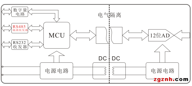 產(chǎn)品采用RS485/232隔離電路,將通信與系統(tǒng)單獨(dú)隔離開,消除通信設(shè)備之間共模干擾