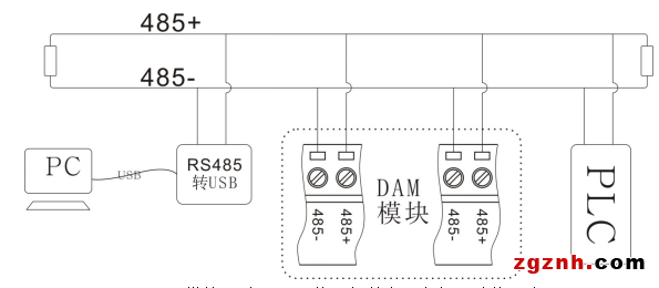 DAM模塊通過RS485接口與其它設(shè)備組網(wǎng)連接示意圖