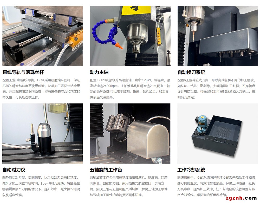 主要性能特點 | 搭載5軸5聯(lián)動工業(yè)級數(shù)控系統(tǒng);支持RTCP刀尖跟隨功能、采用高精度H級等磨直線導(dǎo)軌、鑄鐵床身、采用高精度研磨滾珠絲桿;五軸轉(zhuǎn)臺采用詣波減速機搖籃式結(jié)構(gòu),配有帶移動腳輪的機床底座和內(nèi)置工件水冷循環(huán)系統(tǒng);主要加工材料:鋼、鐵、銅、鋁合金、PVC塑料、有機玻璃等。 |
